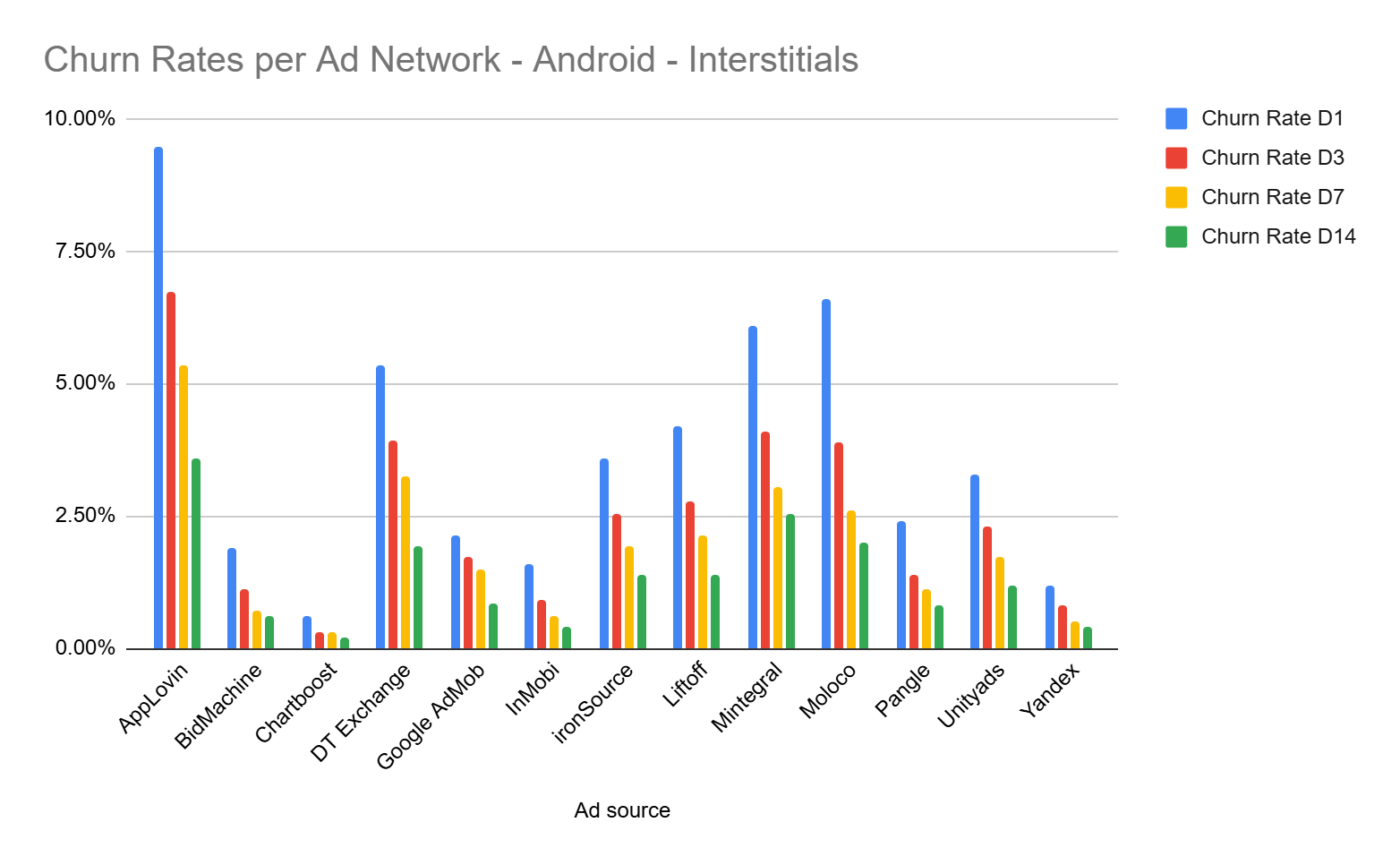 When it comes to CTR, Applovin has the highest values in 13 out of 14 cases. Their Ad Duration is also the highest in 11 out of 14 cases. It’s not surprising that the Churn Rates are also the highest for Applovin in more than half of the cases.