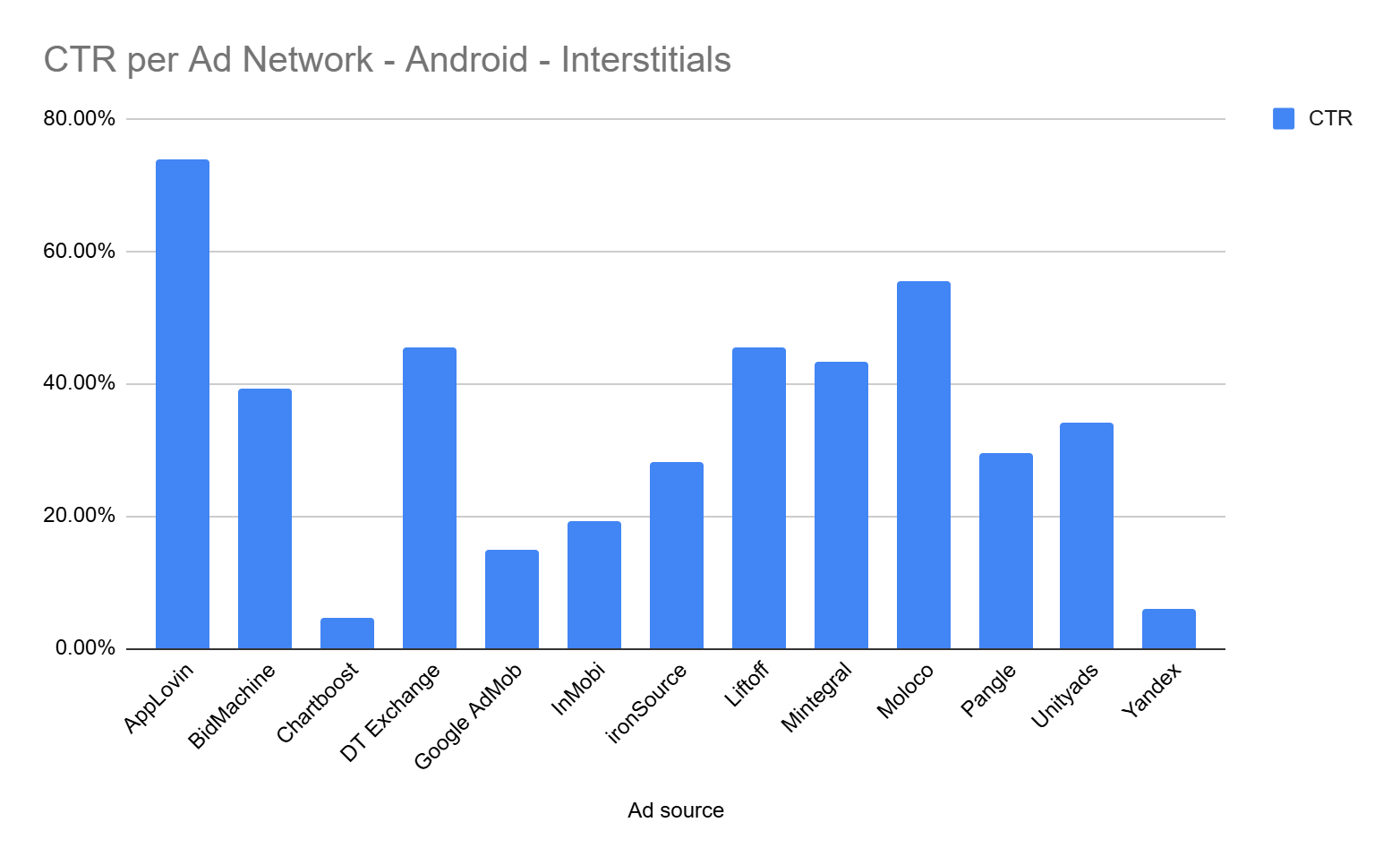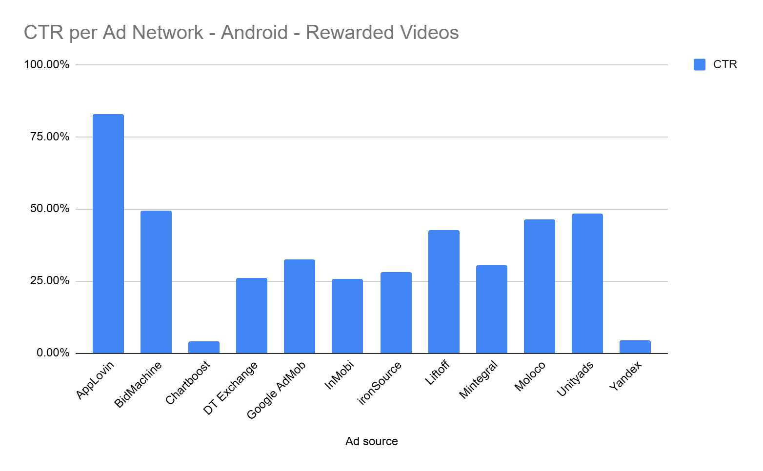 AppLovin is the clear leader on this platform, reaching an 80% CTR. BidMachine and Moloco follow as strong performers, maintaining rates between 45% and 50%. Similar to iOS, Chartboost and Yandex show minimal engagement, both under 10%.