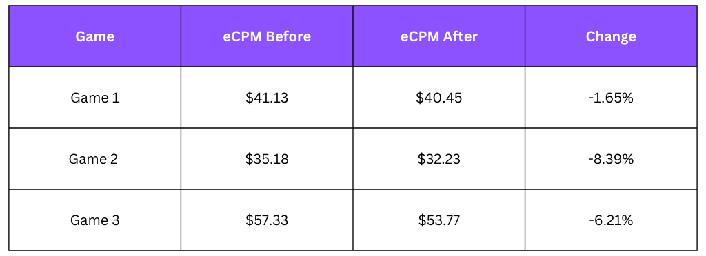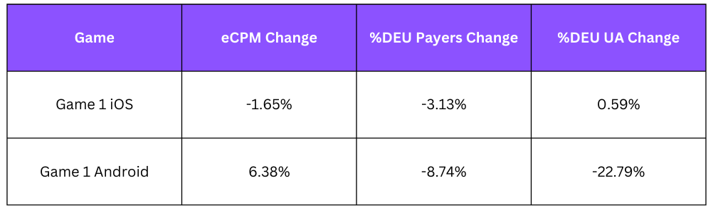 In the tables above we see some decrease in eCPM on iOS and no decrease (even an increase!) in eCPM on Android. But what does this mean? Were completely different results per platform driven by exactly the same changes?