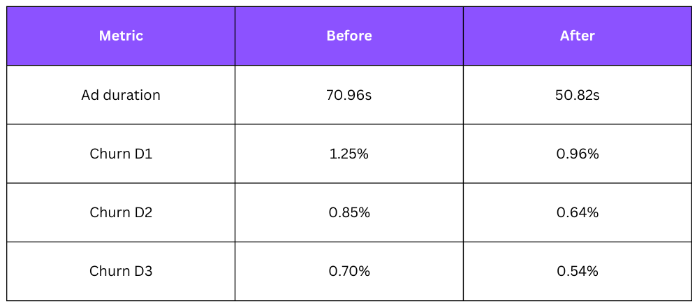 Lastly, we noticed that the share of impressions coming from the networks that were causing the highest churn (in our case Applovin, Moloco and Mintegral) went down from 40% to 35%. It’s possible that other, less aggressive ad networks had a more fair chance to win the auction, with the ad template being more similar across networks.