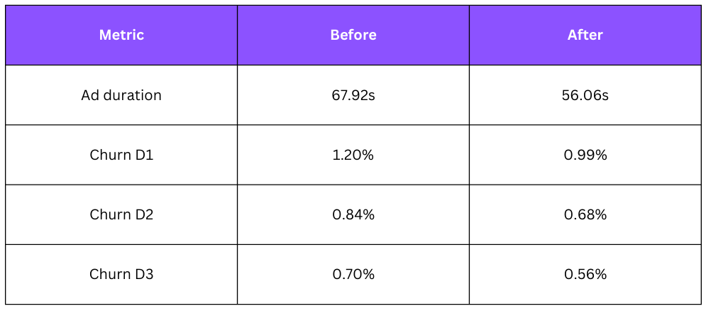 - Ad duration decreased between 12.8% and 28.4%, depending on the game.